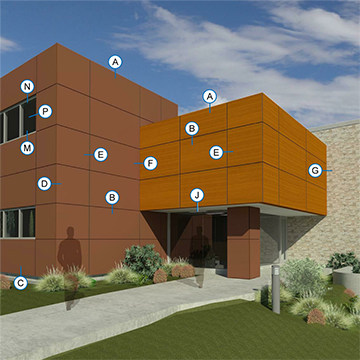 The EV-H.10 Exposed Fastener System, (formerly the ESC 110 system), is a face fastened Drained and Back Ventilated Rainscreen utilizing TRESPA high pressure laminate (HPL) material. TRESPA is a solid and sturdy material that is highly scratch and impact-resistant with an intergraded decorative surface, cured with proprietary EBC technology producing a low-maintenance finish that is easy to clean. The material is available in 8mm, 10mm and 13mm thicknesses and is mounted on a provided engineered grid system, utilizing aluminum extrusions. With the wide range of colors and fasteners available, the design choices are endless.